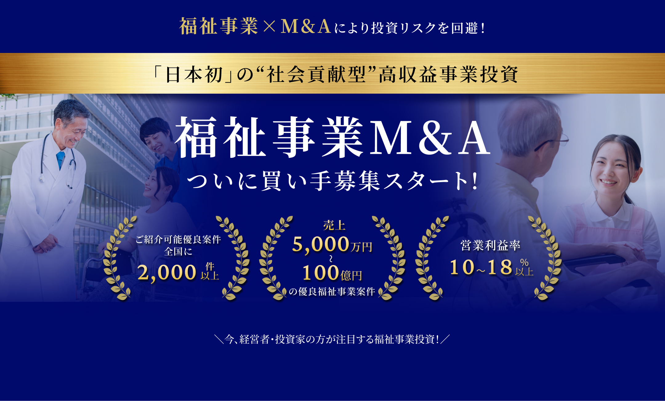 福祉事業の専門会社が運営するM&Aマッチングサービスのため、優良な福祉事業案件を多数紹介できます!買収可能な事業は訪問介護・デイサービス・グループホーム・特養など様々あり、買い手様の理想の事業をご紹介いたします!
